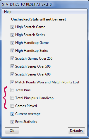 If you want to customize which statistics to reset, then you need to click on the Customize Stat Resets button which brings up the form shown below. On this form you can pick which statistics to reset by putting a check mark before the name of the statistic. After making your selections, you can click on the OK button to save your choices. The Defaults button will put a check mark next to all the listed statistics. You can see that three of the statistics are grouped and will be either set or cleared together. Some leagues want to reset all stats except for the average because they want the average to be based on the whole season and not just on the results for each session.
