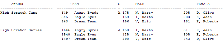 Report Award Options: Standing sheets can include award information such as High Scratch Game, High Handicap Game, etc.