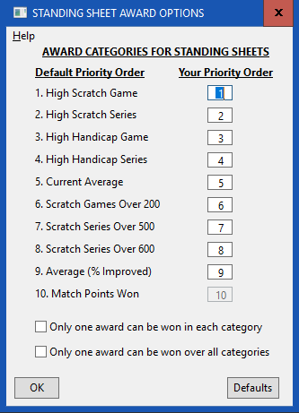 For example: You can specify that the High Handicap Game category comes before the High Scratch Game category by changing the priority for High Handicap Game to 1 and High Scratch Game to 2.